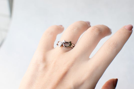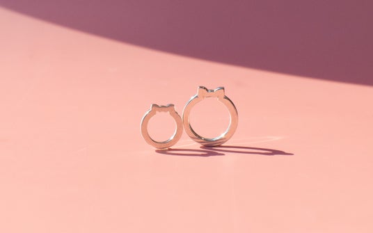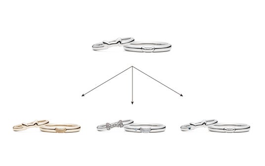 婚約指輪と結婚指輪(ネコ耳)を重ねてネコの顔になるデザインで、今回の子猫(K.O.N.E.K.O.)のベースになったデザイン。ポイントは結婚指輪(ネコ耳)が上、婚約指輪を下に重ねて着ける事ができます。ネコの手(肉球) でダイヤモンドを掴んでいる様子をイメージしてセッティングする肉球留めが特徴的です。爪はぷっくり丸く、石枠を横から見ても愛らしい印象になるように工夫しています。モチーフがカジュアルな印象ですが高級感や上質感を感じられるよう指輪全体のボリューム感とフォルムに拘りました。