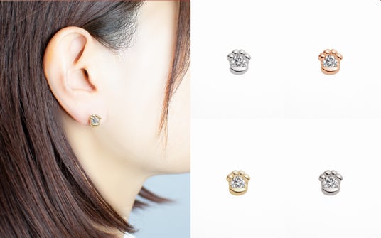 肉球でダイヤモンドを掴んだイメージ。ダイヤモンドの大きさ2種類(0.08ctまたは0.04ct)から、素材(カラー)は4種類(プラチナ、ピンクゴールド、イエローゴールド、ホワイトゴールド)からお選び頂けます。ダイヤモンド0.08ct/63,800円(税込)ダイヤモンド0.04ct/47,300円(税込)※それぞれ片耳一粒の価格です。