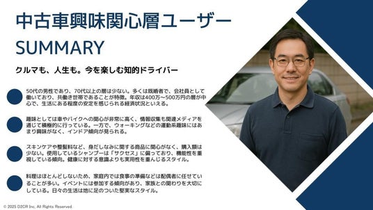 株式会社D2C R(本社:東京都港区、代表取締役社長:豊永 雅史、以下D2C R)は、株式会社NTTドコモ(本社:東京都千代田区、代表取締役社長:前田 義晃、以下ドコモ)が保有する1億超(※1)の会員基盤をベースにしたドコモデータ(※2)を活用したユーザープロファイル分析レポートの第13弾として、「中古自動車」にフォーカスを当てた「中古車興味関心層ユーザープロファイリングレポート」を公開いたしました。