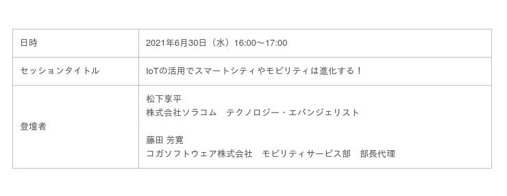 モビリティデータを活用したサービスを提供する株式会社スマートドライブ(本社所在地:東京都千代田区、代表取締役:北川烈、以下「当社」)は、2021年6月29日(火)・30日(水)に開催する「Mobility Transformation 2021」(カンファレンスHP:https://www.mobility-transformation.com/conference/mt2021/)のDAY2(6/30)に、モノのつなぐを簡単にするIoTプラットフォームSORACOMを提供する株式会社ソラコム(本社所在地:東京都世田谷区、代表取締役社長:玉川憲、以下「ソラコム」)の登壇が決定しましたのでお知らせします。