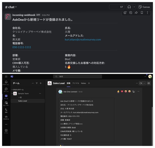 「Slack」および「Teams」とAsk Oneを連携することで、フォームへの入力完了時にリアルタイムにメッセージを任意のチャンネルに、カスタマイズしたメッセージを投稿することが可能になります。