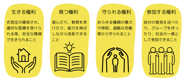 子どもの権利は、1)生きる権利、2)育つ権利、3)守られる権利、4)参加する権利の4つに大きく分類されます。