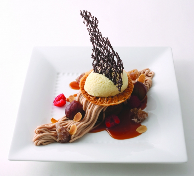 ヴィタメール神戸大丸店では、ショコラ・ショーのポットサービスなど、ゆったりとしたカフェスペースで召し上がっていただく、こだわりのメニューをご用意しております。10/1(土)からは、人気のプレートメニューに秋限定の『モンブラン仕立てのフォンダンショコラ』が登場しております。温かいフォンダンショコラの上にモンブランクリームを贅沢にのせ、栗をあしらいました。温かいキャラメルソース、冷たいバニラアイスクリームが合わさって、口の中でとろける秋限定の美味しさです。