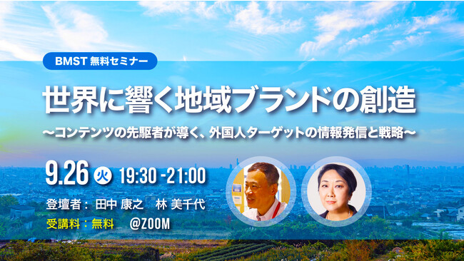 日本映像翻訳アカデミー株式会社(本社:東京都中央区、代表取締役:新楽直樹、以下「JVTA」)が運営する世界水準のビジネス戦略を学ぶ「ブランド&マーケティング・ストラテジスト養成コース(以下、BMST)」は、インバウンド対策の強化のために必要なスキルを教える無料セミナー「世界に響く地域ブランドの創造~コンテンツの先駆者が導く、外国人ターゲットの情報発信と戦略~」を2023年9月26日(火)に開催します。