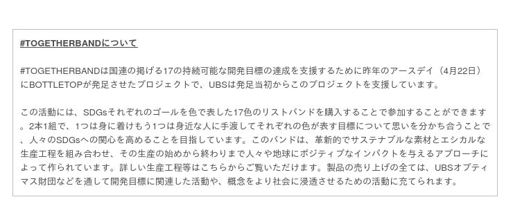 世界最大級の金融機関であるUBSは、富裕層個人のお客様、従業員、機関投資家、そして社会に魅力的で長期的な価値を提供すべく事業を行っています。2000年に「人権」、「労働」、「環境」、「腐敗防止」を目標に発足した国連のグローバル・コンパクトに最初に署名した44社のうちの一社でもあります。UBSは今回、#TOGETHERBANDにプロジェクトパートナーとして参加し、この人々の生活を変えるプロジェクトの財政的支援をUBSオプティマス財団が行う栄誉にあずかりました。