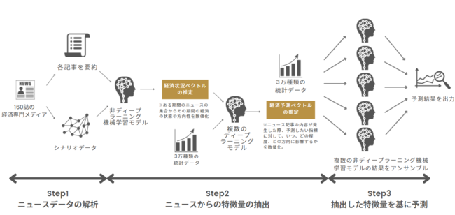 Step1で解析した構造化データから、「経済状況ベクトル」、「経済予測ベクトル」(※2)という2段階の解析で予測対象に対する特徴量の抽出を行います。