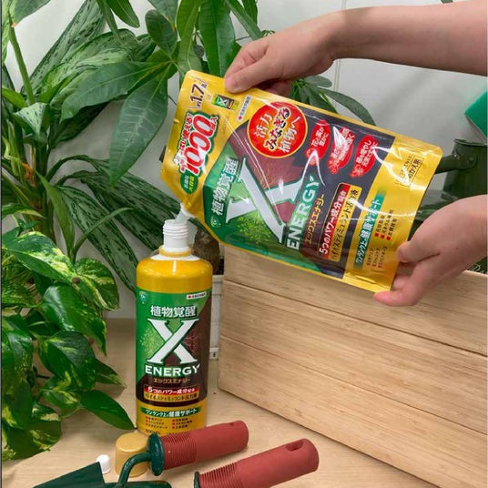 「X-ENERGY」は、水で希釈して植物に与えるだけで、植物の根を刺激し、環境ストレスに負けない健やかな生育をサポートするバイオスティミュラント成分を配合した活力液です。2025年春の発売以来、多くのご愛用者さまからの好評を受け、つめかえ用として本体サイズの約1.7倍の大容量サイズを新たに発売します。