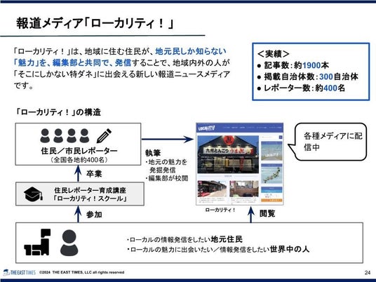 そこで培った手法を、ジャーナリズムの手法と政治学・社会学の理論に基づいた独自の「FLAG RELATIONS理論」として構築し、企業や組織、ローカルに対して、戦略的共感ブランディング事業を展開しています。そして、そのような事業を展開する中で2020年10月に生まれたのが、報道メディア「ローカリティ!」です。ローカリティ!は、独自プログラム「ローカリティ!スクール」を卒業した地域住民が、「地域レポーター(ハツレポーター)」となり、自分の地域の魅力を編集部とともに発信する新しい形の報道メディアです。現在は、北海道・網走から、南紀・那智勝浦、宮古島からフィリピンまで、約400名のレポーターが、オンラインコミュニティを通じて活動しています。