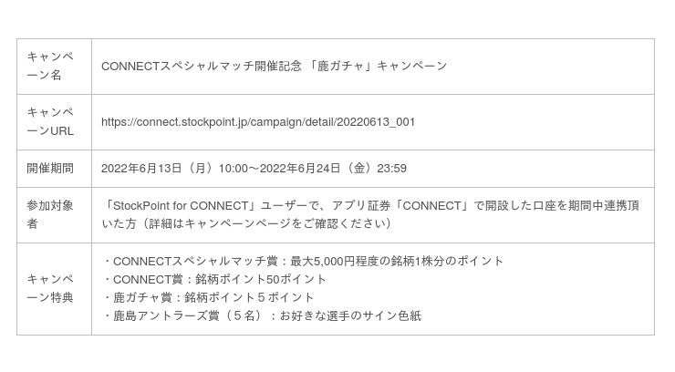 STOCK POINT株式会社(本社:東京都港区、代表取締役社長:土屋清美、以下「STOCK POINT」「当社」)は、2022年6月13日(月)より、大和証券グループの株式会社CONNECT(本社:東京都中央区、代表取締役社長:大槻 竜児、以下「CONNECT」)と提供するポイント運用サービス「StockPoint for CONNECT」において、「鹿島アントラーズ「CONNECTスペシャルマッチ」開催記念!鹿ガチャ」キャンペーンを開催いたします。本キャンペーンでは、1日1回ガチャに挑戦でき、抽選で株式交換が可能なポイントや選手のサイン色紙がもらえます。