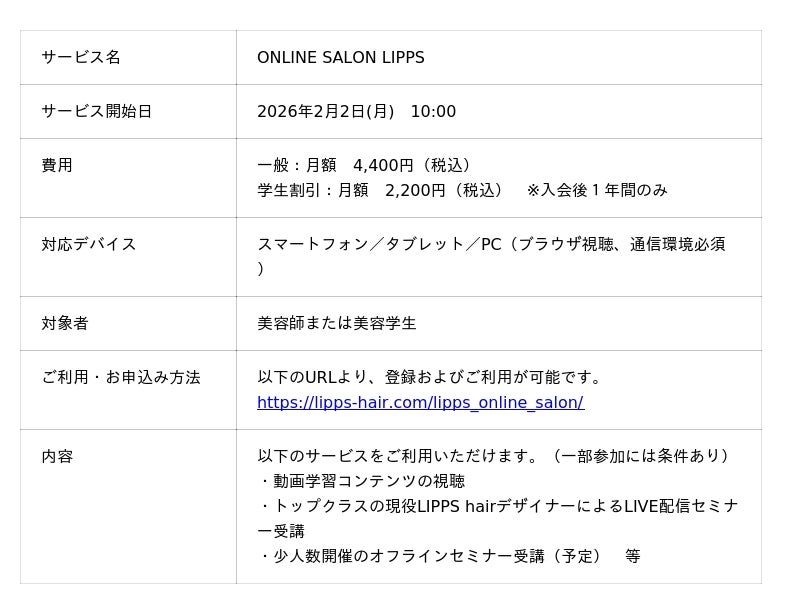 メンズコスメ商品の企画・販売、ヘアサロンFC事業を営む株式会社リップス(本社:東京都渋谷区、代表取締役:的場隆光、以下「LIPPS」)は、美容師・美容学生を対象としたサブスクリプション型eラーニングサービス「ONLINE SALON LIPPS(以下「本サービス」)」を2026年2月2日(月)より提供開始いたします。本サービスでは、LIPPSが創業した1999年から26年にわたり培ってきた「メンズヘアの技術や知識、考え方」を体系化し、場所や時間に縛られず学べるオンライン学習環境を提供します。