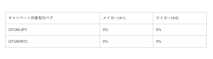 また、クアンタム(QTUM)の取扱いを記念して、QTUM/JPYおよびQTUM/BTCの取引手数料無料キャンペーンを開催します。