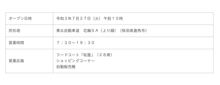 NEXCO東日本東北支社(仙台市宮城野区)及びネクセリア東日本株式会社東北支店(仙台市青葉区)並びに株式会社松屋フーズ(東京都武蔵野市)は、E4東北自動車道 花輪サービスエリア(SA)(上り線)に「松屋」をオープンします。