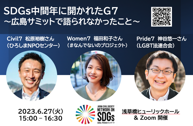 一般社団法人SDGs市民社会ネットワーク(東京都千代田区、共同代表:大橋正明・三輪敦子)は、5月に開催されたG7広島サミットの成果を踏まえ、エンゲージメントグループである「Civil 7(C7)」、「Women 7(W7)」、「Pride 7(P7)」と共に活動を振り返るとともに、次回G7サミットが日本で開催される2030年にむけて、持続可能な社会のありかたを考えるイベント(対面・オンライン)を開催します。