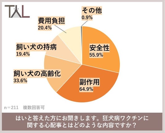 犬の飼い主211名に対し「狂犬病ワクチンに関する心配事とはどのような内容ですか?」と質問したところ、1位副作用(64.9%)、2位安全性(55.9%)、3位飼い犬の高齢化(33.6%)という結果となり、そのほかには飼い犬の持病(19.4%)や費用負担(20.4%)といった回答も見られました。その他には、「自分以外の飼い主が飼い犬にワクチン接種をしているのか心配」といった声もありました。