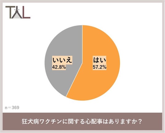 犬の飼い主369名に対し「狂犬病ワクチンに関する心配事はありますか?」と質問したところ、「はい」と答えた飼い主は57.2%、「いいえ」が42.8%という結果になりました。多くの飼い主が狂犬病ワクチンの必要性を理解しながらも、飼い犬のワクチン接種に対して半数の飼い主が不安を感じている実態が見えました。