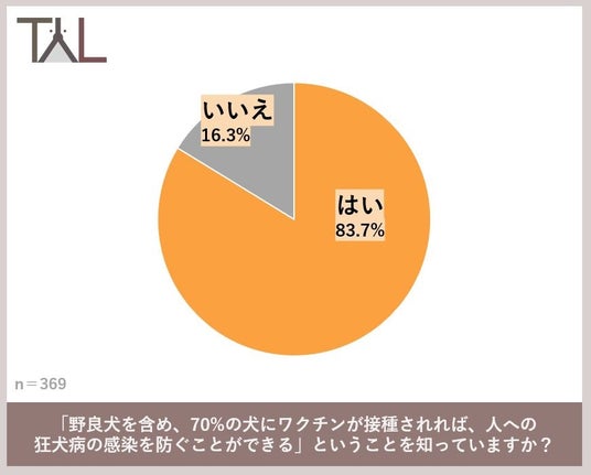 犬の飼い主369名に対し「野良犬を含め、70%の犬にワクチンが接種されれば、人への狂犬病の感染を防ぐことができ、感染経路を遮断することができます。このことを知っていましたか?」と質問したところ、「はい」と答えた飼い主は83.7%、「いいえ」が16.3%という結果になりました。8割以上の飼い主が、なぜ狂犬病ワクチンの接種が必要なのかを認知していることが分かりました。