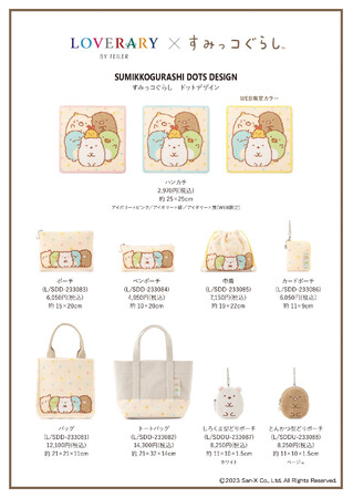 販売するアイテムは、ハンカチ3種類(縁どりのカラー違い) 各¥2,970(25×25cm)、ポーチ¥6,050(15×20cm)、ペンポーチ¥4,950(10×20cm)、カードポーチ¥6,050(11×9cm)、巾着¥7,150(19×22cm)、バッグ¥12,100(21×21×11cm)、トートバッグ¥14,300(21×32×14cm)、しろくま型どりポーチ¥8,250(11×10×1.5cm)、とんかつ型どりポーチ¥8,250(11×10×1.5cm)の全11種類です。