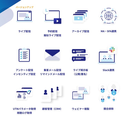 本機能の提供により、今まで他のツールとの連携が必要だったライブ配信でもEventHubのみで配信が行えるようになり、EventHub単体で手間なくスムーズなライブ配信を可能にしました。なお、引き続きZoomやYouTubeなど、外部の動画配信ツールとの連携でのライブ配信機能も提供していきます。配信手法以外も「メール配信」「アンケート」「MA・SFA連携」などウェビナーマーケティングに必要な機能をオールインワンで提供しています。