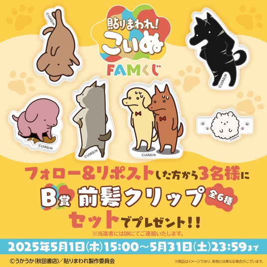 期間中に「FAMくじオンライン」の公式Xアカウント(@FAMKUJI_ONLINE)をフォローし、キャンペーン投稿をリポストすることで、抽選で3名様にB賞の「『貼りまわれ!こいぬ』前髪クリップ全6種セット」をプレゼントいたします。