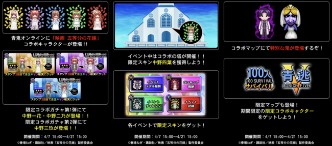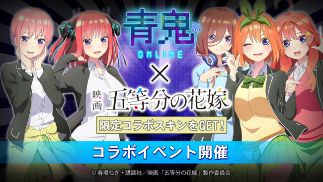 株式会社GOODROID(本社:東京都目黒区、代表取締役社長:松田和彬)は、最大100人のキャラクターが青鬼から逃げ回るマップの中で最後の一人として生き残ることを目指すオンライン・サバイバルゲーム『青鬼オンライン』にて、映画『 五等分の花嫁』コラボイベントが4月7日15:00より開始したことをお知らせいたします。