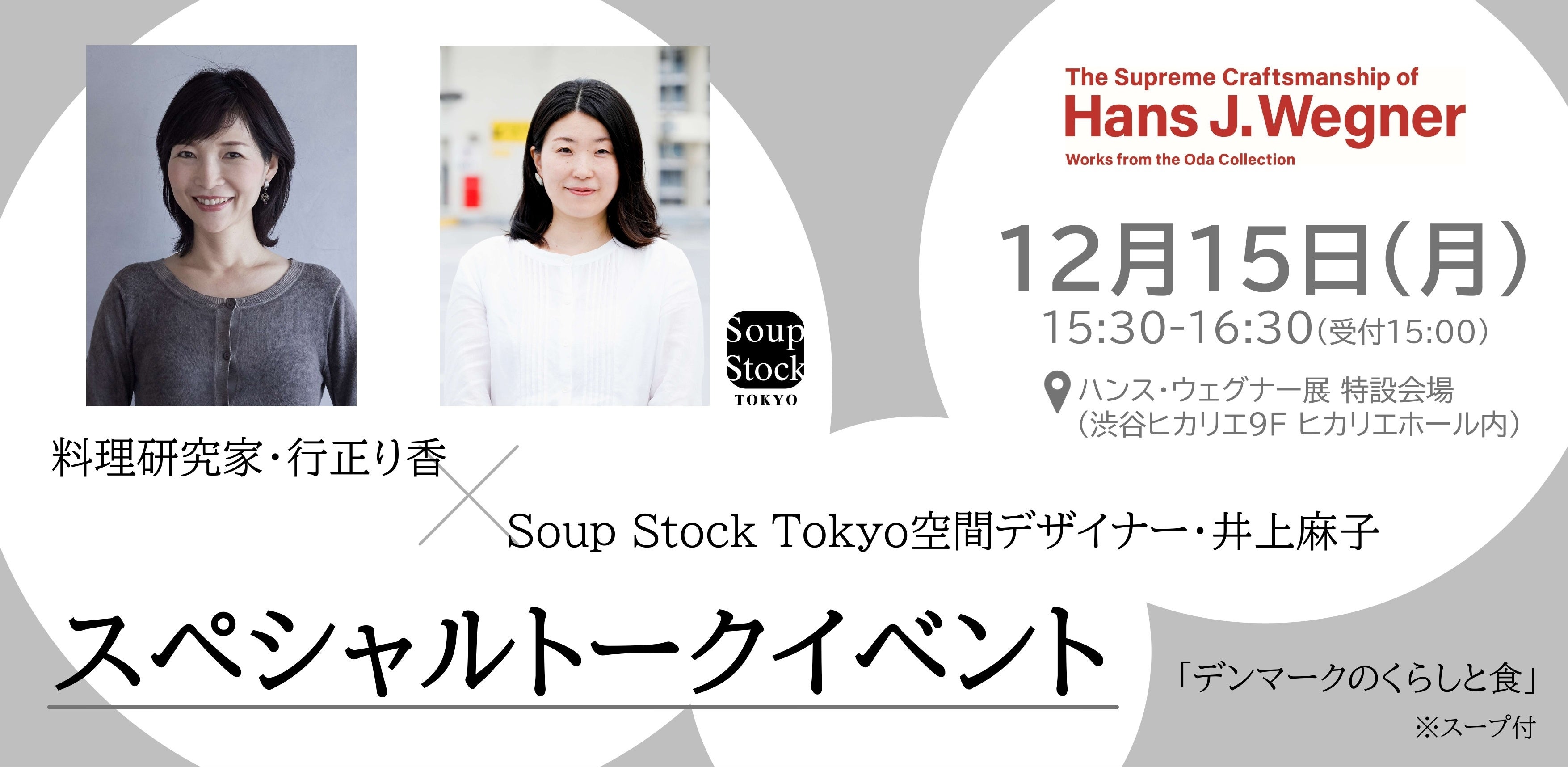 料理研究家・行正り香さんと、Soup Stock Tokyo空間デザイナー・井上麻子さんのスペシャルトークイベントを開催いたします。元デンマーク親善大使であり、ご自宅でウェグナーの家具を愛用し、インテリアの書籍も出版している行正さんと、Soup Stock Tokyoで店舗設計を担当している井上さんによる、家具と食事の重要な関係性やウェグナーデザインのタイムレスな魅力、そして本展のためにSoup Stock Tokyoがご用意するデンマーク風にアレンジをした特別なスープが楽しめる冬の午後にぴったりなイベントです。