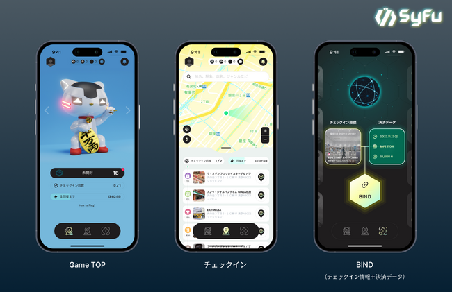 - 後日、キャッシュレス決済のデータがSyFuアプリに取り込まれ、チェックインデータと決済データを紐づける「BIND」が成功すると、デジタル鞠が開封され、デジタル資産が獲得されます。