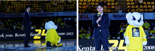 最後に、広瀬氏より「監督・コーチ、チームメイトにすごく恵まれた14年間でした。今回もこのようなセレモニーをしていただき、こんなにも多くの方に会場に残っていただけて、引退会見に加えてセレモニーまでしてもらって申し訳ない気持ちですが、とても嬉しいです。14年間プレーを続けられたのは、元気な体に生んでくれて育ててくれた両親と、ずっと支えてくれた妻に感謝しています。こんな湿っぽくなるつもりはなかったですが、ありがとうございました。」と現役生活を振り返り涙ぐむシーンもありました。「僕も会場にできる限り来て応援するので、みなさんもこれからも一緒にサンロッカーズを応援していただけたらと思います。今日も素晴らしい試合でセレモニーさせないためにどんどん延長しているんじゃないかってドキドキしましたが、勝ってくれて気持ちよく送り出してもらったと思います。これからもサンロッカーズをよろしくお願いします。」と会場に集まった観客やバスケットLIVEの視聴者に向けてメッセージを送り、締めくくりました。