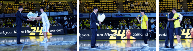 また、セレモニーでは当日の対戦対手である島根スサノオマジックの阿部諒選手、サンロッカーズ渋谷から木下博之アシスタントコーチ、キャプテン・ベンドラメ礼生選手から花束の贈呈と広瀬氏に言葉をかけました。