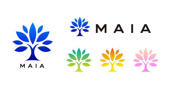 新しいロゴのデザインは、旧ロゴで撒かれた種が芽吹きそれぞれ木として成長していく姿を女性たちが自立してそ れぞれのフィールドで活躍する姿に重ねて表現しました。シンボリックにしつつも宝石や刻印のような上品さが感 じられるように曲線を描きました。各々様々な方法で成長していくという思いを込め、メインカラーは従来のMAIAブルーを継承しながら様々な色バリエーションを設けています。