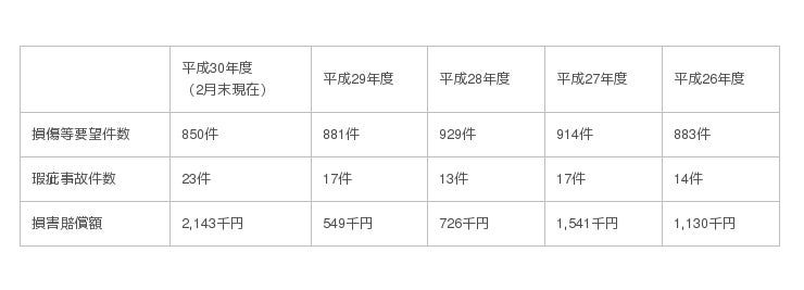 平成26年から平成29年度まで穴ぼこ等道路の損傷による事故について、件数は横ばい、損害賠償は減少傾向にあったが、今年度は現時点でも前年度を大幅に上回っている。