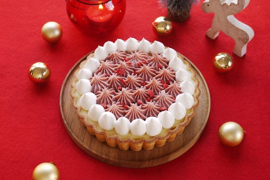 定番商品の蜜いもクリームタルトのトップのクリームにラズベリーを加えたクリスマス限定のタルトをご用意!甘酸っぱさと赤いクリームの見た目が食卓にクリスマスらしさを演出します。