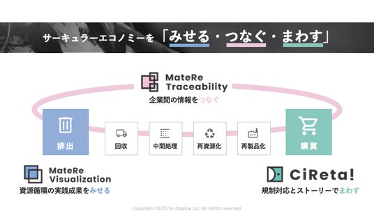 また、ステークホルダーの協力を得ていくために、弊社提供の資源循環デジタルプラットフォーム「MateRe-Visualization(マテリ・ビジュアライゼーション)」や「MateRe-Traceability(マテリ・トレーサビリティ)」を活用し、温室効果ガス(GHG)排出量やトレーサビリティデータの可視化を行うことでステークホルダーへの提案を進めていきます。本取り組みは、官民連携による循環経済のさらなる理解醸成と取組促進を目指す「循環経済パートナーシップ(J4CE)」にも事例として掲載されています。