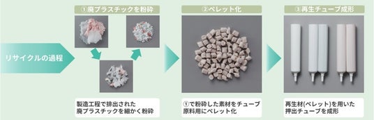 こうした課題に対し、大和製罐とdigglue ではリサイクル事業を展開するヴェオリア・ジャパングループ協力のもと、押出チューブにおける製造工程で排出された廃プラスチックを粉砕・再生ペレット化。そこで得られた再生プラスチック材を配合し、押出チューブの試作~品質評価~効果試算までを行いました(2023 年)。