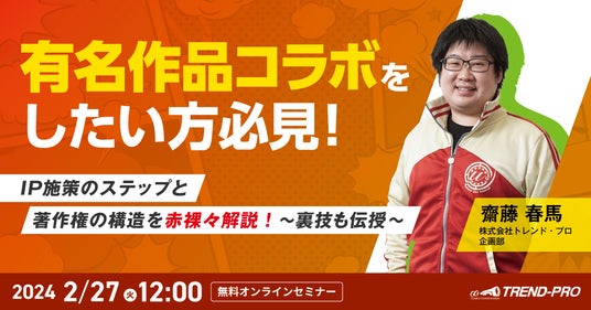 株式会社トレンド・プロ(本社:東京都港区、代表取締役社長:岡崎寛之、以下トレンド・プロ)は、有名作品コラボ(IP活用)をする際に知っておくべき施策のステップと著作権の構造を解説する無料オンラインセミナーを2024年2月27日(火)12時から開催いたします。