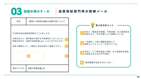 そのため本資料は、標的型攻撃メール訓練の全体像を整理し、製造業の皆さんが手順に沿って進めるだけで効率的な訓練を実施できるよう作成しました。