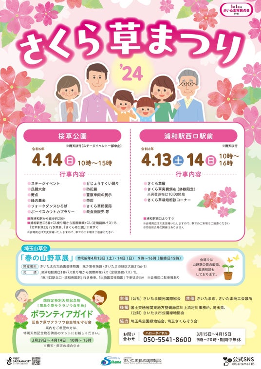 4月14日(日)に桜草公園(田島ケ原サクラソウ自生地)で、4月13日(土)・14日(日)に浦和駅西口駅前会場で、「さくら草まつり’24」を開催します。さくら草まつりは、田島ケ原のサクラソウの開花時期に合わせて例年開催しています。