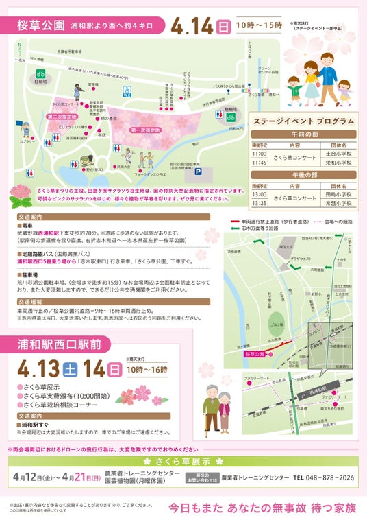 桜草公園では、ステージイベントや民踊大会、フォークダンスなどが行われ、飲食物の販売も行います。浦和駅西口駅前会場では、さくら草の実費頒布や展示のほか、栽培相談コーナーの設置を行います。