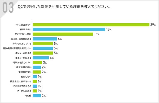 選択した媒体を利用している理由を自由回答形式で伺い、その結果をグラフにまとめました。最も多かったのは「特に理由はない」で29%でした。知っている媒体だから、以前から使っているから、などの経緯であまり考えずに利用しているユーザーが多い、ということが読み取れます。