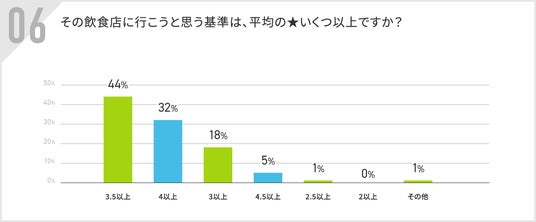 星いくつ以上であればその飲食店を選ぶ決め手になるか、を伺ったところ「3.5以上」と答えた方が最多でした。「4以上」「4.5以上」を含めると77%の人が3.5以上の基準で飲食店を選んでいることが分かります。