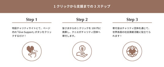 本プログラムでは、さまざまな社会課題への取り組みを支援できるよう、12カ月間毎月異なるチャリティ団体への寄付を行っています。 ステークホルダー参加型のチャリティプログラムをコンセプトとし、どなたでも参加することが可能です。参加者は、PCやスマートフォン等から特設サイトへアクセスし、当月の寄付団体の活動概要やクリックで実現できる寄付内容の例を確認し、“Give Support”ボタンをクリックするのみ。その1クリックを100円として換算し、その月の合計額をクニエがチャリティ団体へ寄付します。