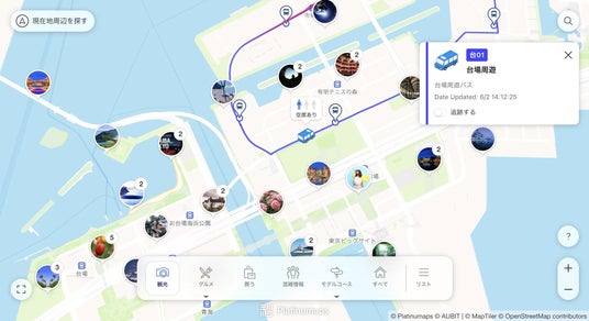 プラチナマップは、オリジナルのデジタルマップを誰でも簡単に作れる「マッププラットフォーム」です。スタンプラリー、クーポン、予約機能、混雑情報配信などの機能など、観光DXに特化した機能を多数実装。必要な時に必要な機能を必要な分だけ利用できるのが特長です。