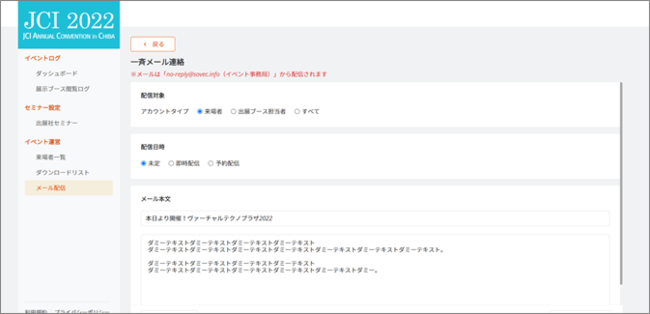 登録済みの来場者向け・出展者様向けに一斉メール配信機能を追加。日時設定もでき、効果的なタイミングでのメール案内が可能です。