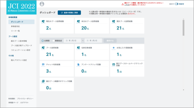 出展者ダッシュボードでは、来場者数や名刺交換者数、各展示コンテンツの閲覧数など、ブースの状況をリアルタイムで把握することができ、来場者の行動履歴付きのリード情報もいつでもダウンロードが可能です。