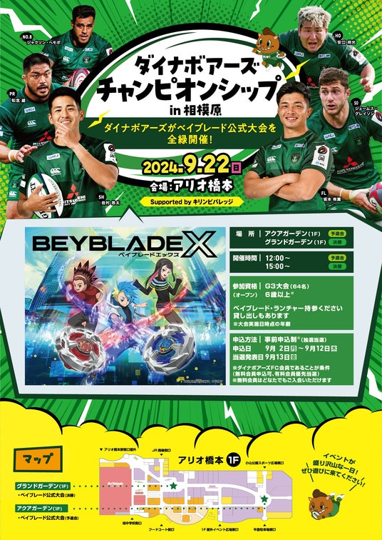 またフェスタ内のイベントとして、BEYBLADE X(ベイブレードエックス)の公式大会『BEYBLADE X ダイナボアーズチャンピオンシップin 相模原』の開催が決定!2023-24シーズン中はタカラトミー様にGEAR SPORTS(ギアスポーツ)としての『BEYBLADE X』が持つ競技性とぶつかり合うラグビーとの親和性にご賛同いただきコラボイベントを実施。それに続く形でこのたび公式大会の開催に至りました。