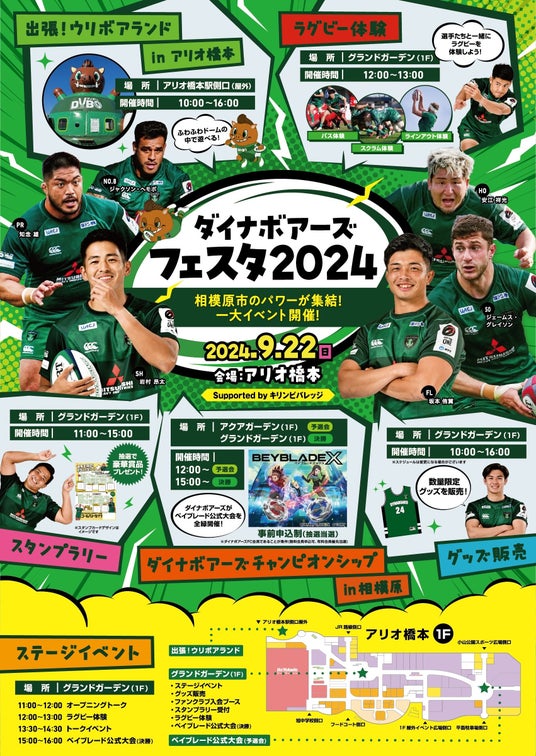 三菱重工相模原ダイナボアーズは、9月22日(日)に『ダイナボアーズフェスタ2024 supported byキリンビバレッジ』を開催しますので、お知らせいたします。神奈川県相模原市の大型商業施設・アリオ橋本でのダイナボアーズフェスタは今年で3回目。今回はゴールドパートナーでもあるキリンビバレッジ様から強力なサポートを得て、ますますイベントを盛り上げてまいります。