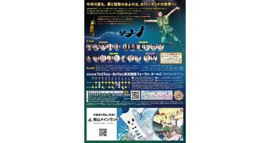 株式会社青山メインランド(所在地:東京都千代田区、代表取締役 西原良三)は、ホリプロ主催・企画制作「青山メインランドファンタジースペシャル ブロードウェイミュージカル『ピーター・パン』」に特別協賛することをお知らせいたします。東京公演は2026年7月27日(月)~8月7日(金)、東京国際フォーラム ホールCにて上演されます。