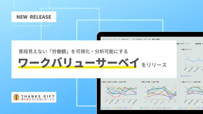 エンゲージメントプラットフォーム「THANKS GIFT-サンクスギフト」を運営する株式会社TakeAction(本社:東京都品川区、代表取締役社長:成田靖也)は普段見えづらい仕事に対する価値観の可視化・分析を可能にする「ワークバリューサーベイ」をリリースしました。