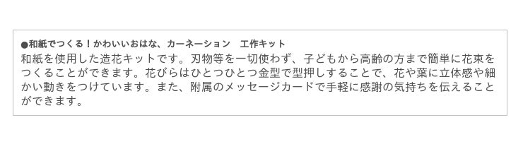 内容 2020年度のトライアル発注認定商品「和紙でつくるかわいいおはな、カーネーション 工作キット」(有限会社町田造花)の工作ワークショップを実施します。