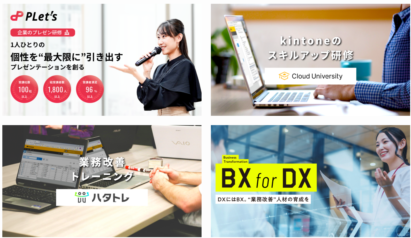 kintone初級者向け、AI/プラグイン/連携サービス活用、あるいはハイレベルな開発者養成まで幅広い講座ラインナップでDX人材育成を支援。加えて、kintone活用による業務改善の伴走支援も提供し、個々の企業に合わせたDX推進を総合的にサポートします。