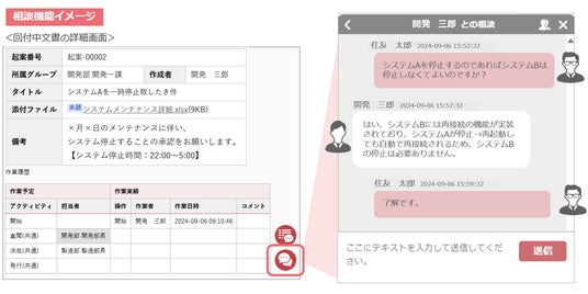 楽々Document Plusでは、ワークフロー機能を標準搭載しており、登録した文書を正式版として公開する前に、システム上で上長や責任者の承認を得ることが可能です。今回、新たに追加された「相談機能」では、承認者が回付中の文書に対して申請者や他の承認者とチャットでやりとりできます。これにより、承認者はシステム上で申請者と疑問点を共有したり、他の承認者と情報を交換したりすることで、円滑な承認プロセスを進められます。